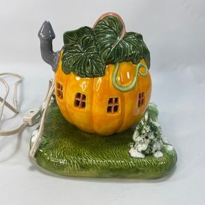 Add a festive touch to your Halloween decor with this vintage 2-piece ceramic pumpkin house and snowy yard set by Scioto Molds. The intricate details of the pumpkins, trees, and snowy landscape come together to create a charming display that will delight both kids and adults alike. The built-in light adds a cozy glow to the scene. Perfect for Halloween, this set is a must-have for collectors of holiday and seasonal items.