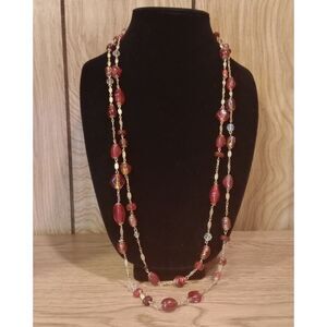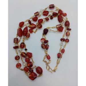 Vtg. 2 Strand Filigree Link Red Orange Murano Style Glass Gold Tone 32" Necklace