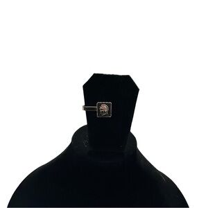 Add a touch of elegance to your formal attire with this vintage 2 tone silver and black enamel tie bar. The square shape features a 3-Dimensional Spartan in an ornate helm, adding a touch of antiquity and beauty to your suit accessory collection. The tie clip is 1.25 inches in length and made of metal and enamel, with an unknown base metal, probably stainless steel.