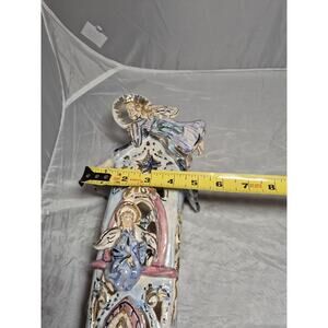 The Vtg 2001 Blue Sky Clayworks HEAVENS ANGELS Christmas Decoration by artist Heather Goldminc is a beautifully crafted ceramic tea light featuring a multicolor design. Part of the Angel Collection, this handmade piece from Blue Sky Clayworks embodies the theme of Christmas with its Heaven's Angels style. With its unique and original design, this collectible item brings a touch of holiday charm to any space.