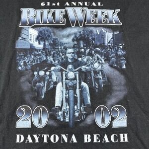 This product is a vintage 2002 Daytona Beach Bike Week T-shirt in size 2XL. The black shirt features a crew neck and short sleeves, making it a comfortable and stylish choice for men who are fans of motorcycle rallies. The shirt is double-sided, showcasing a design related to the motorcycle theme. Made by Fruit of the Loom in Mexico, this regular fit T-shirt is a unique and nostalgic addition to any wardrobe.