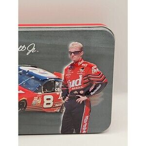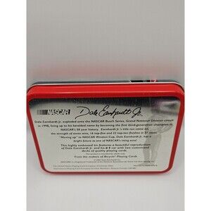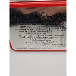 This product is a vintage 2002 tin case containing two unopened sealed decks of playing cards featuring Dale Earnhardt Jr. The playing cards are official licensed by NASCAR and bear the branding of Dale Earnhardt Jr., his team Dale Earnhardt Inc., and the sport of auto racing. The multi-color decks are a unique collectible for fans of the driver and the sport, suitable for unisex adults and proudly manufactured in the United States.