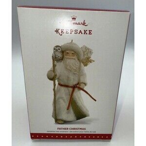 Beautiful 2015 Hallmark Keepsake Ornament Father Christmas with Owl, the 12th in the Father Christmas Series designed by Joanne Eschrich. This detailed Santa features a peaceful snowy owl perched beside him and a scroll inscribed with words of hope and wisdom.