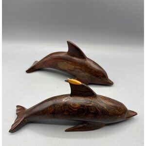 Elegant hand-carved wooden figurines showcasing a bird (Crane or Pelican?) and two dolphins. Perfect as a decorative piece for nature-themed or rustic interiors.