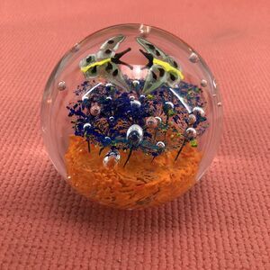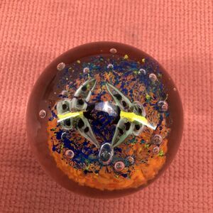 Vtg 3.25” Round Glass Paperweight Orange Blue 2 Butterfly Hand Blown Bubbles