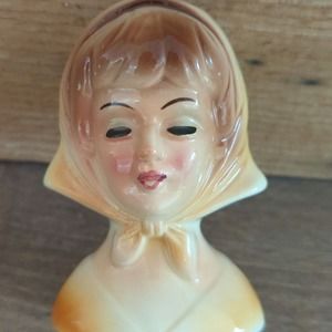 Mini lady head vase with hooded scarf tied under chin. Pouty mauve lips. Her eyes are closed and her black eyelashes that are in great condition. Her hair is brown.