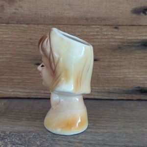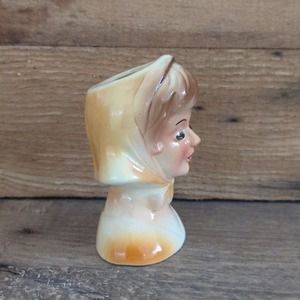 Vtg 3.75" Mini Lady Head Vase Mustard Yellow Hooded Scarf Japan Matching Dress