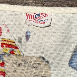 Two different groupings of favorite things repeat 6 times for a total of 12 panels. Ballet tickets, keys, watches, lockets, etc. are "pinned" to heavy white cotton sailcloth in trompe l'oeil style. The Wilendur tag is attached.
