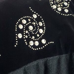 the velvet seam on the back of the neck has come unsewn a bit - couple of swirls are missing a tiny dot or two - about a 2 inch spot of the quilted inside seam at the label has come unsewn - see pics