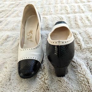 Vtg. 40s AirStep Snakeprint Spectator Cuban Heel Mid Height Pumps, Sz. 6 / 6.5