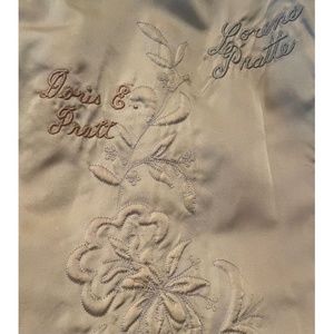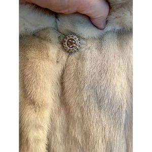 Mink is cream with light brown stripes. Has a large set back collar. Three quarter sleeves. Side slit pockets. And closes with one bejeweled button at the neck. Lined in matching satin fabric with a slit pocket, floral pattern at the sides and monogramed twice, Lorene Pratte and Doris & Pratte. No brand label present but does have the fur authority label. In Very Good condition, there is a light brownish tinge on the right side of the lining, a place at the collar where the threads are loose and a worn fur spot on the top left shoulder, see last two pictures.