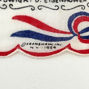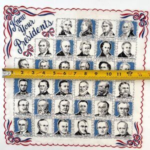 Vtg 50s Know Your Presidents Scallop Hem Novelty Print Hanky Scarf USA Patriot Franshaw Mid Century Americana Measures approx. 13” x 13”