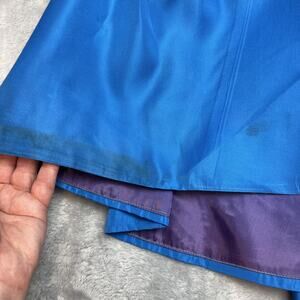 This shows significant discolorations, none of which are super visible. It could use a trip to the dry cleaners and perhaps they can remove most or all of them. Such a unique piece! Reminds me of something Doris Day would wear back in the day. The dress is great for daytime, then add the overskirt for a more formal look, or vice versa. The color is a cross between turquoise, teal, and royal blue. Fabric is like a taffeta.