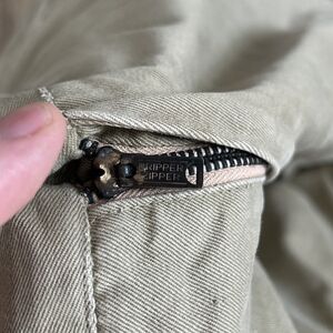 Gripper zipper, true vintage. Lots of stains that look like they could come out. This was a barn find.