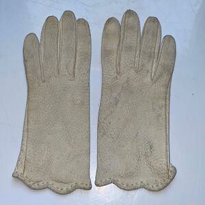 Vtg 50s/60s light gray pebbled Leather gloves with scalloped hems at wrist