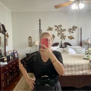 Vintage 50s/60s black heavily beaded & sequined blouse with satin bow at waist & dolman butterfly sleeves