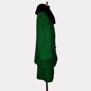 Kelly green boucle wool w jet black mouton fur notched collar. Phenomenal jacket is ¾ length w raglan sleeves. Has seam details, double breast appearance w black molded dome buttons, welt pockets & satin lining. Matching lined skirt has set-On waistband, side zipper/hook & eye closure. Label: Meyer Jonasson, Altoona, PA. Never Worn Excellent Condition.