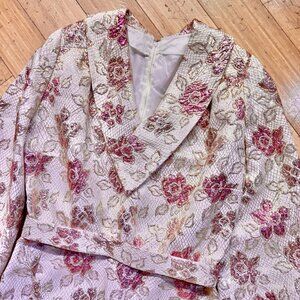 Sparkly vintage 60s 70s floral hostess gown in pink, gold & off-white. Fabric is a nice weight floral brocade with metallic lurex thread, lined w polyester. Incredible soft & bright color; hard to capture with camera phone; sleeve close-up is most accurate. Blouson bodice, fitted long skirt, bishop sleeves, matching belt. True maxi dress: floor length even on 5'8" model. Shown on sz 12, fits exactly -- could also work for 8-10 with waist cinched. See measurements for best fit. EUC, no flaws, light wear.