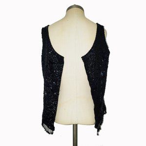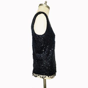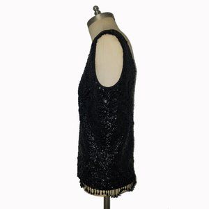 Black sequin and hand beaded top by Marianne Fashions. Has a shell silhouette with full length back zipper. Scope neckline, wide bra-friendly straps and bead dangles around the hem. Made in British Hong Kong. 100% wool, rayon lining. Excellent Condition.