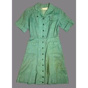 Vtg 60s Girl Scouts Green Button Front Dress Uniform Patch Pockets Flawed READ