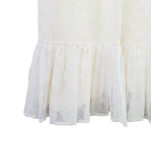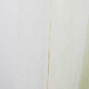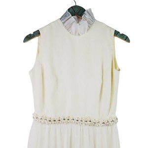 Layered design sheer fabric over a butter cream yellow satin bodice with iridescent beading and ice blue rhinestones intertwined with a beautiful off-white twine.