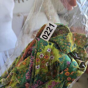 This vibrant vintage 1960s-style mini dress bursts with mod energy, featuring a bold psychedelic floral print in bright shades of green, yellow, orange, and pink. Designed with a flattering mini length, it showcases a sharply pointed collar, long sleeves, and a front button closure that runs the full length of the dress.