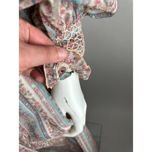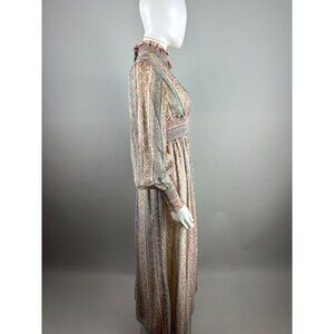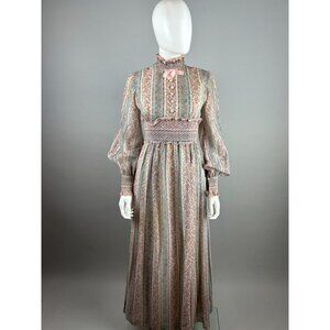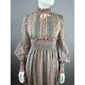 Vtg 60s Prairie Cottagecore High Neck Floral Striped Maxi Dress Balloon Sleeve S
