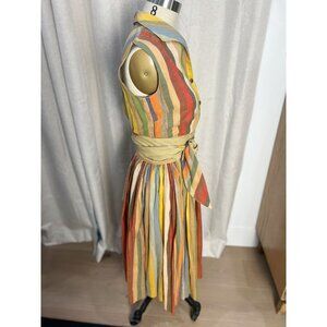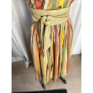 This vibrant QUEEN CASUALS two-piece set from the 1960s features a button front sleeveless top paired with a pleated skirt. The bold vertical stripes in warm earthy tones evoke a fun, vintage summer aesthetic. Great for days when you want a coordinated retro look without going full dress.