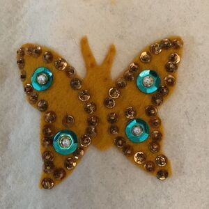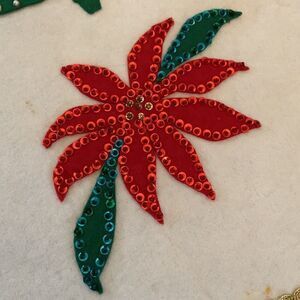 Good vintage with some discoloration but most of the felt appliqués and beads/spangles are intact