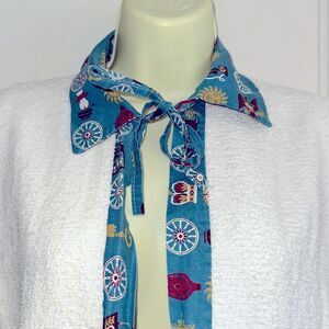 Vintage 60s white terry cloth swimsuit coverup with fun turquoise retro print trim featuring a sun, old fashioned telephone, eagle, wheel, lamp, tea kettle, etc