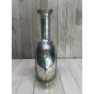 A stunning vintage silver mercury glass bottle vase, featuring an etched carving base perfect for adding elegance to any space. Ideal for collectors and home decorators.