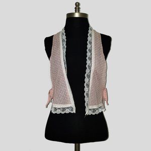 Jacket: white lace around neck, hem, down center of open front, open sides close with string ties. Dress: Spaghetti straps. fitted bodice, white lace trim at top, empire waist, pink satin ribbon tie, long skirt with front/back center panels, handkerchief hem, back zipper, fully lined. Excellent Condition. 65% Polyester, 35% Cotton, 100% Acetate lining.