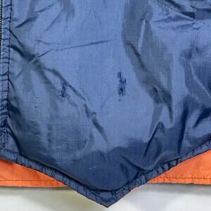 Vintage 70s/80s reversible down puffer vest — navy blue on one side, bright safety orange on the other. . Utility style pockets with vintage cartridge loops. 80/20 duck down + feather fill, rib knit collar, made in Taiwan, Republic of China. Distressed workwear vibe with visible wear, tear + repairs that add character. Refer to images for condition. Due to light and screen difference, the color may be slightly different from the picture.