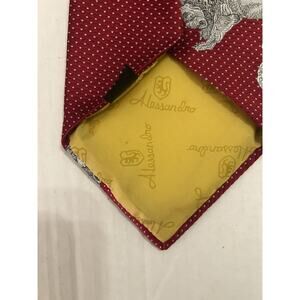The product is a vintage 70s men's tie with a lions head design, made of red polyester with a wide width of 4.5 inches. This retro necktie features an embroidered animal print pattern, making it a unique and stylish accessory for a classic or MCM-inspired look. The tie is one size, 54 inches in length, and crafted by the brand Allesandro in the United States, perfect for adding a touch of old-school flair to any outfit.