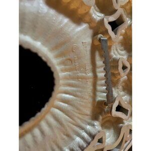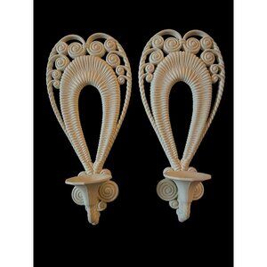 These vintage '70s candleholders by Burwood Products Co. feature an intricate faux wicker design in off-white. Ideal for wall-mounted candlelight accents.