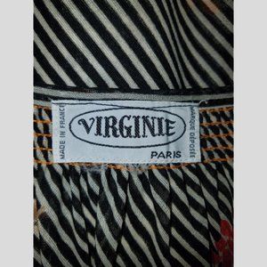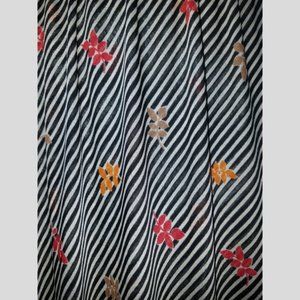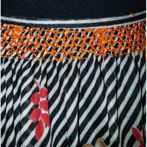 Cream and black diagonal stripes with orange, red and bronze leaf pattern. Semi sheer bodice with elbow length, elastic cuff sleeves, embroidered neckline, shoulder cutout with tie and elastic waist. Skirt is double layered, full and has asymmetrical ruffled hem.