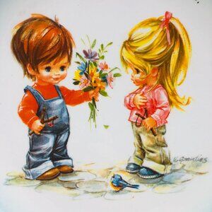 Vintage American Greetings collectible plate, dated 1972, features a little boy giving a little girl a bouquet of flowers while a robin watches. Very sweet, retro image perfect to display as vintage decor or to serve refreshments to a friend.