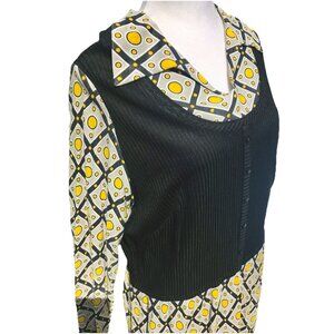 The product is a vintage 1970s Montgomery Ward maxi knit dress in an abstract geometric black, yellow, and gray color scheme. This Mod/GoGo style dress is made of knit polyester and was originally manufactured in the United States. Perfect for everyday wear, this regular size dress exudes a retro charm with its long length and unique color combination. A rare find for collectors of vintage women's clothing, this original piece offers a glimpse into the fashion trends of the 1970s. Please see pics for measurements as well as 3 small snags in fabric which are pointed out wirh back of the ruler.