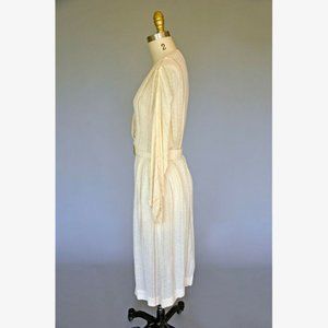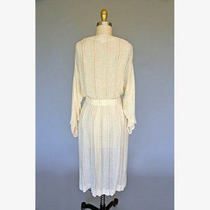 Vtg 70s Ivory Metallic Gold Weave Belted Dress 12P