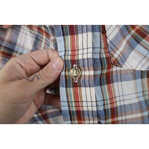 Missing button, loose threads buttons. Collar, cuffs discolored. Color faded. Pilling, fabric pulls. Loose threads collar, cuffs. Made in USA