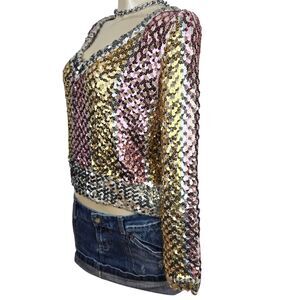 This vintage 70s Lilli Diamond sequin sweater top in a size M features a whimsical design, perfect for a fairycore, disco, or bohemian style. The long sleeve V-neck sweater in cream, gold, pink, and silver colors is made of knit fabric and adorned with sequin accents. Ideal for travel, parties, or casual occasions, this sweater is a unique and stylish addition to any wardrobe, offering a touch of retro charm and flair. Hand wash only to preserve its beauty and keep it looking its best.