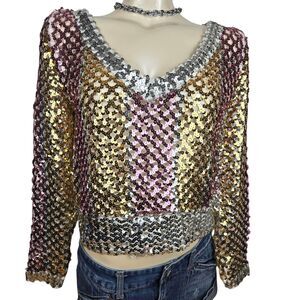 Vtg 70s Lilli Diamond Sequin Knit Top M Long Sleeve V-Neck Fairy Whimsy Disco