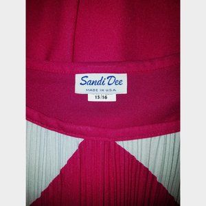Vintage 1970's dress in fuchsia and light grey soft polyester. Features puffy 3/4 sleeves with elastic cuff. Two tone accordion pleat bodice. Elastic waist with tie. And gathered full skirt. New Old Stock without Tag, Excellent Condition. Label: Sandi Dee. Fabric: 100% polyester.