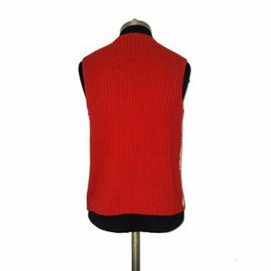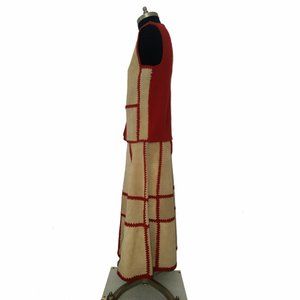 Tan suede patchwork design with brick red acrylic knit details. Open front paneled vest with patch pockets and sweater knit back. Skirt is high waist A-line silhouette with back zipper/snap closure. Very Good Condition with minor spots/stains.