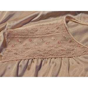 Vintage 70s polyester pink nightgown by Vanity Fair with lace detail around collar and sleeve. Pocket on right side. XXL
