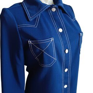 This vintage-inspired 70's women's double knit top features long sleeves and a stylish button-up design. The contrast stitching adds a unique touch, making it a versatile piece for any wardrobe.