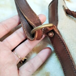 Vintage late 70s early 80s, Authentic Dooney & Burke Cinch/drawstring genuine leather bag. Several damages all shown in the pictures. Amazing condition for its age, large sized bucket bag in cream/eggshell and brown color combo. Tassels in great condition, beautiful cottagecore/Coquette bag.