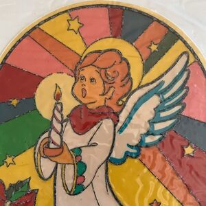 Vintage 70s Instant Stained Glass self adhesive hand painted Christmas scene of an angel holding a candle & singing with bells, presents & stars in Original Packaging