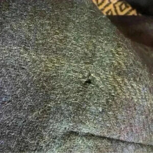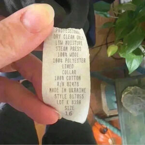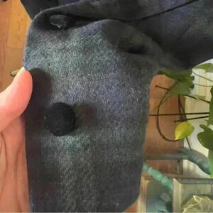 Only one tiny hole found on back bottom of jacket, not noticeable while wearing! Great condition otherwise. Has shoulder pads. Velvet trim on collar and velvet buttons. Great for fall and holidays!