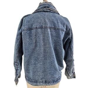 Step back in time with this fun vintage acid washed double-breasted denim jacket from the 80s /90s, featuring beautiful gold metallic embroidery on the big notched double collar, the back one being accented with studs. This remarkable piece, size M, is in excellent condition, showcasing no flaws. Perfect for adding a dash of retro charm to your wardrobe!